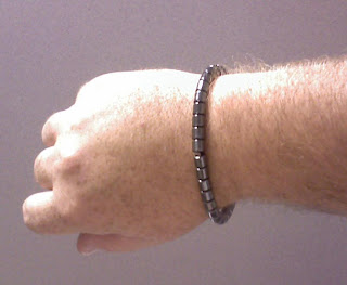 I found this hematite bracelet at the Jtown Gaslight Festival. Supposedly it will cure anything that could possibly be wrong with a human body. The iron is absorbed into the bloodstream and increases the oxygen level... Anyway, it looked cool. My girlfriend was gonna get it for me but after she accidentally broke a clay flute and had to buy it, I wouldn't let her. Besides, it was cheap...